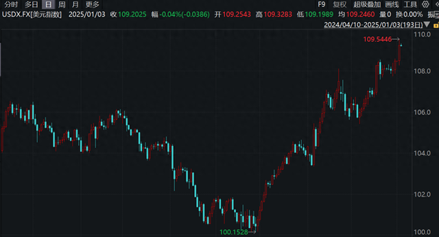 【环球网财经记者 田刚】2025年1月2日,美元指数上涨0.7%,为2022年11月以来的最高水平。对此Hargreaves Lansdown的货币和市场主管苏珊娜·斯特里特在一份报告中也提到:“随着消费者和企业摆脱了高利率的影响,失业率保持在较低水平,经济增长一直超过预期。”